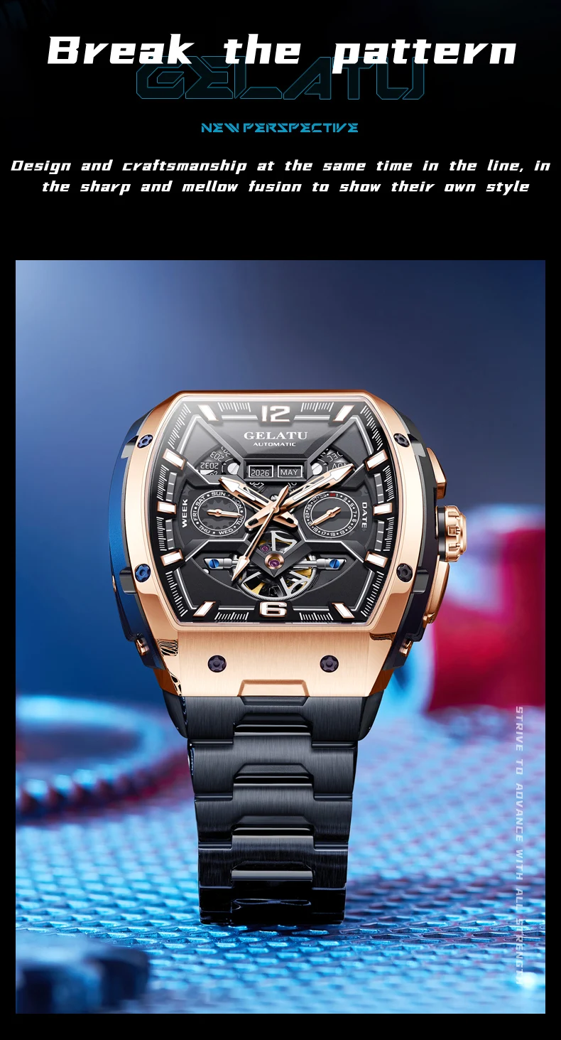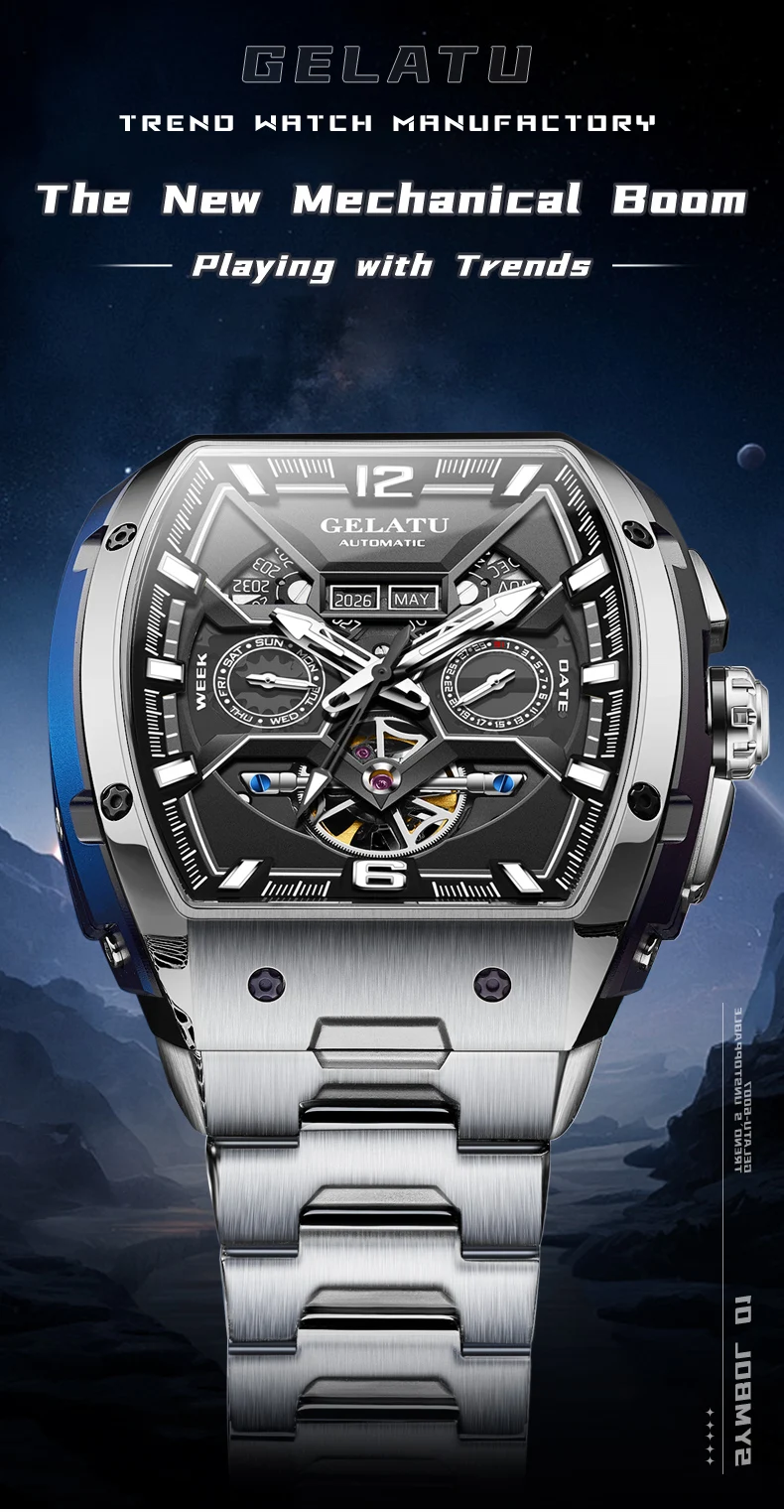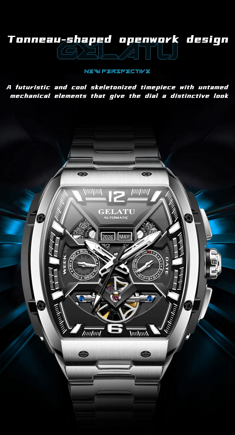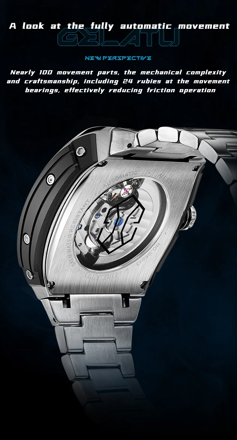 GELATU 6013 Herren-Luxus-Hohl-Automatik-Mechanik-Originaluhr, neues Skelett, wasserdicht, multifunktionale Marken-Herrenuhr