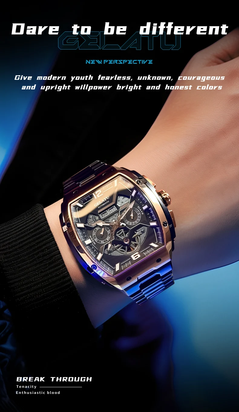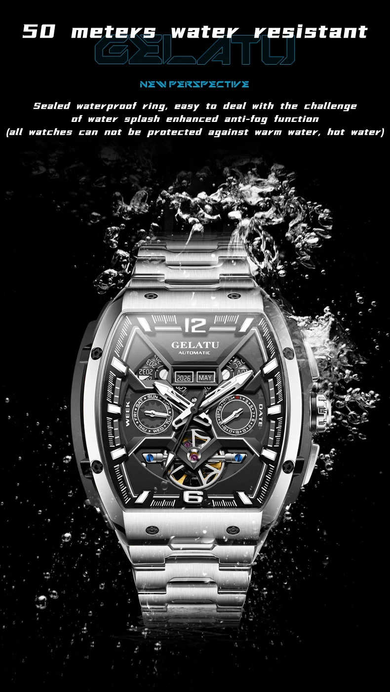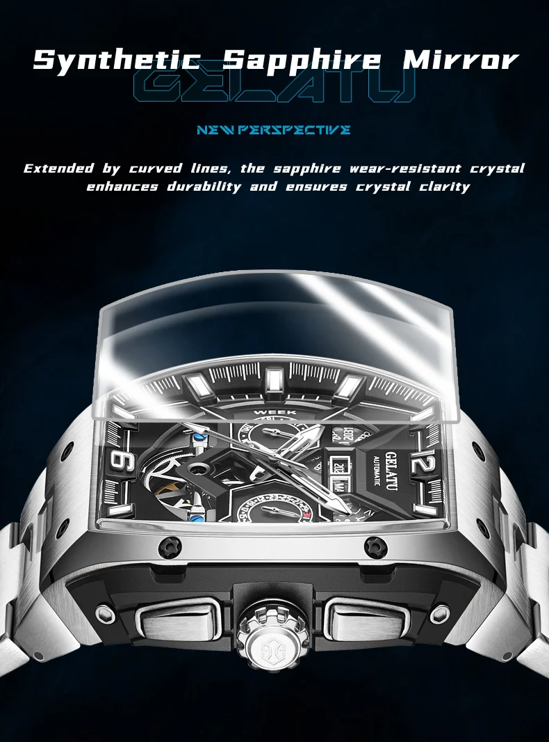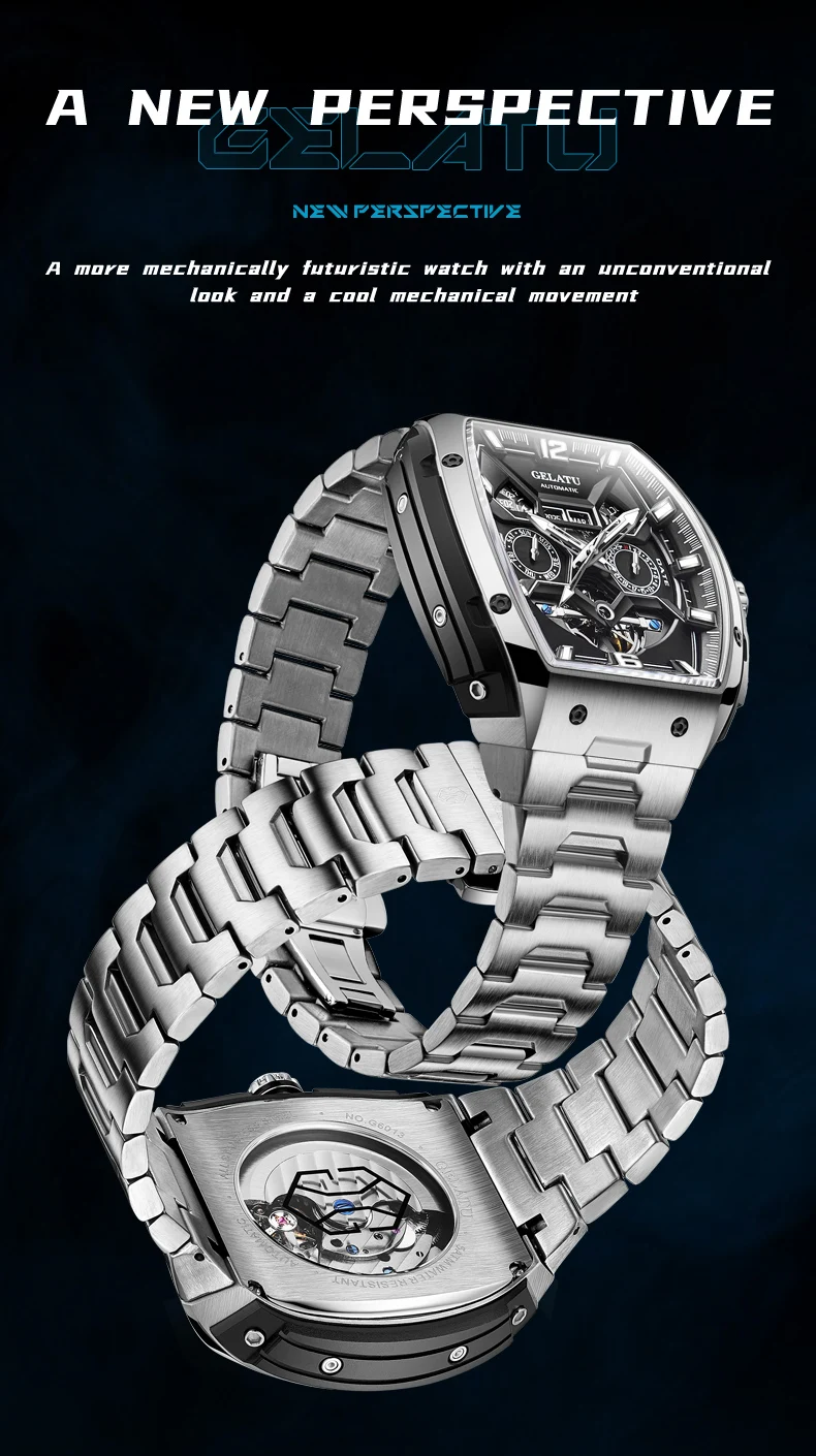 GELATU 6013 Herren-Luxus-Hohl-Automatik-Mechanik-Originaluhr, neues Skelett, wasserdicht, multifunktionale Marken-Herrenuhr