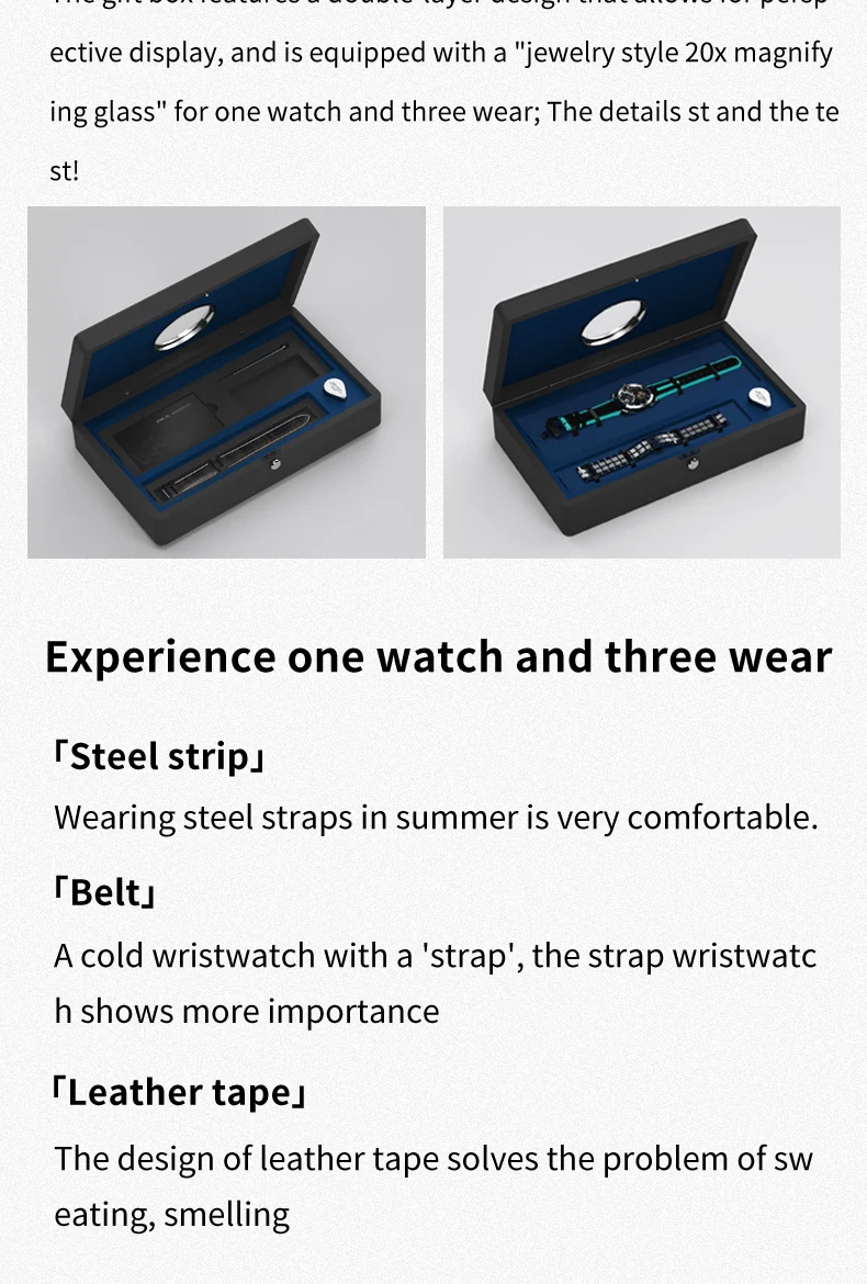 oge waardevolle horloge: 1 horloge, 3 manieren, stalen band, leren band, band is beschikbaar. de drie soorten horlogebandjes waren gratis gegeven)
