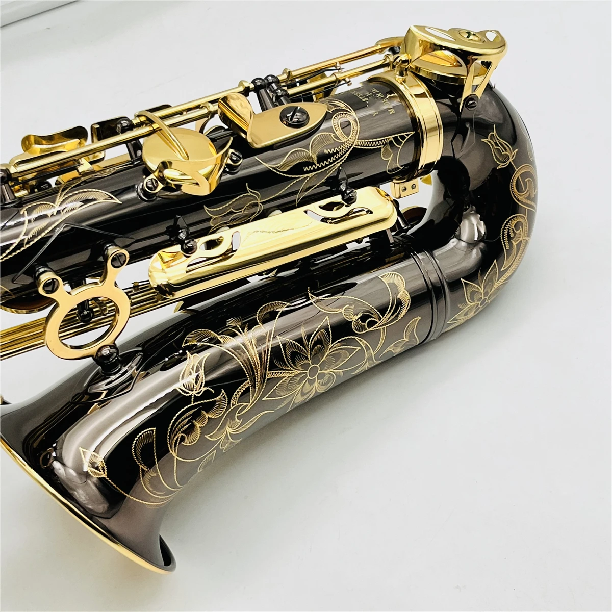 Real Pictures 875EX Altsaxophon Eb Tuner Schwarz vernickelt Gold geschnitzter Körper Professioneller Holzblasinstrument mit Kofferzubehör